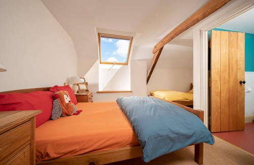 Family bedroom 3: King sized bed, single bed, drawers & free standing wardrobe, bedside table. En-sutie has a sink, toilet and shower.