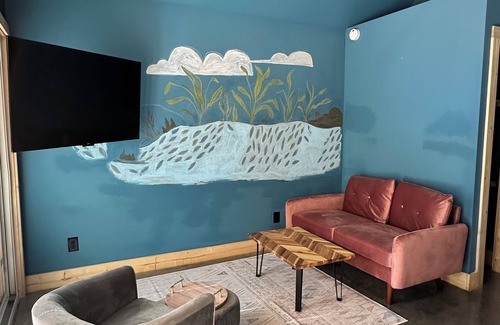 The Blue Heron is one of three new builds at Saluda Outdoor Center. Each house has its own aesthetic based on birds in the area. They each have a spacious and cozy living space, fully supplied kitchenette, bedroom, and gorgeous top the line bathroom. You'll have amazing and private views of the Saluda River to help you relax and be at peace. The kitchenette has a full size fridge, microwave, hot plate, toaster oven, and a Keurig. There is also cooking and eating supplies. There is also a Roku Smart TV. There is a private and cozy outdoor space with comfy chairs and a gas fire pit. There is also a picnic table.