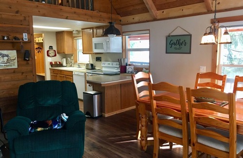 The Cabin's main living space has a large living room with plenty of space for everyone to hang out. Get cozy with a wood burning stove. All wood is provided. The dining table will expand to seat 10 and there is an extra table and chairs in bedroom closet if needed.