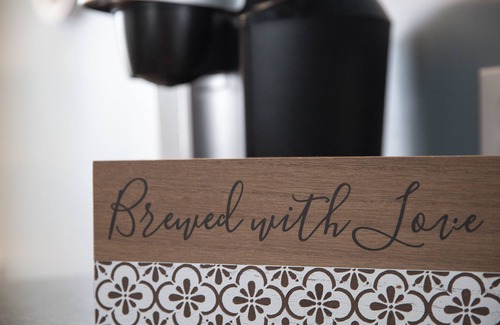 The adjacent kitchen is fully equipped with everything you need for a comfortable stay, including a stove, oven, microwave, fridge, freezer, dishwasher, Keurig, toaster, and seating for 4. Whether you’re cooking up a quick breakfast or a full dinner, you’ll have all the essentials at your fingertips.