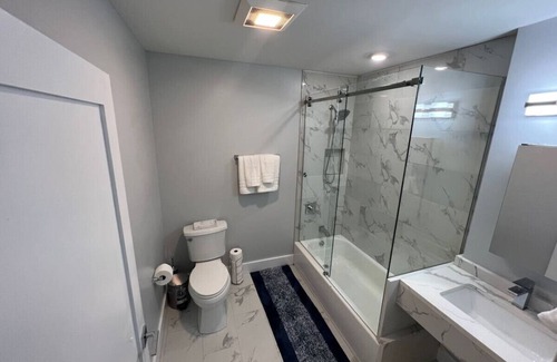 The bathroom is modern, clean, spacious, and stocked with all essential toiletries and high-quality towels.