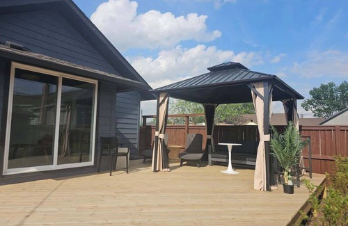 Step inside and enjoy a warm, inviting living area with a decorative fireplace, thoughtfully curated furnishings, and natural light pouring through the windows. The fully equipped kitchen and adjacent dining space make it easy to share meals or entertain. Downstairs, the finished basement features a game area with a ski hockey table—perfect for winding down or bringing the group together for a little friendly competition. Kick back and relax in this beautifully renovated home that blends historic charm with modern comfort. Whether you're visiting for business, pleasure, or a little of both, you'll find everything you need for a cozy and convenient stay.