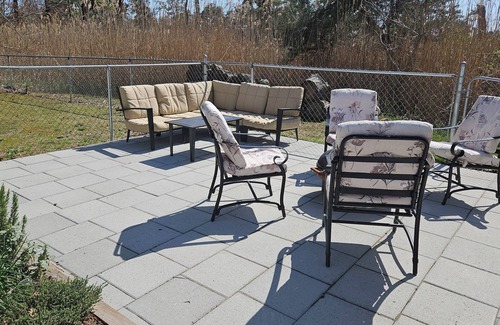 Our 3-season back porch and outside patio are perfect for lounging after a day at the beach. Behind the house has been home for an aerie of Bald Eagles. So far we have counted 6 different members. Let us know if you count more!! The patio is equipped with a firepit, propane grill, and ample seating.