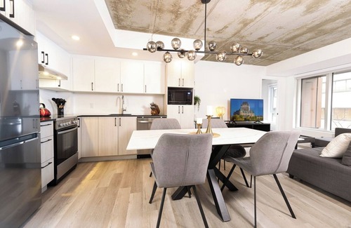 Come and enjoy an unforgettable stay in the heart of the Saint-Roch district in Quebec City. These two modern and luxurious condos will charm you as much by their common spaces as by their interior design.
