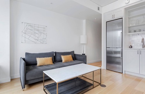 The kitchen is complete with dish-ware and offers stainless appliances, gas range, soft-close solid maple cabinets and quartz countertops. The spacious urban bedroom has a queen size bed, fresh linen, and custom closets. Included is an in-unit high efficiency washer/dryer. Step into the rich bathroom which features Calacatta marble and quality finishes.