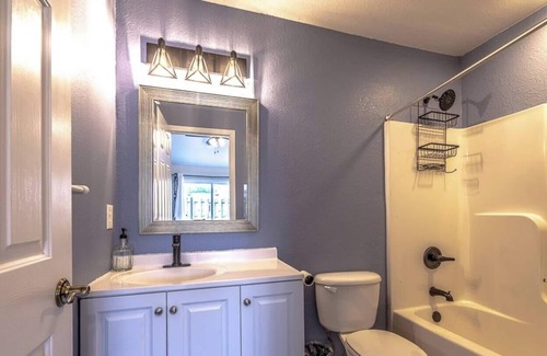 The condo has a built in desk in the sitting room area for your laptop or if you need to work remotely. The entire main living room is completely open including the front entry way, dining room, living room, office and sitting room, kitchen, laundry room, side patio door and 2 car garage access. The condo has been recently renovated and updated. The kitchen is fully equipped and you can help yourself to anything in it. Keurig, toaster, all cookware and utensils needed, full range gas stove and oven, refrigerator, dishwasher, sink disposal. Washer and dryer with detergent & dryer sheets included; as well as an iron, hair dryer, shampoo, conditioner, body wash, towels, linens, pillows, blankets, etc.