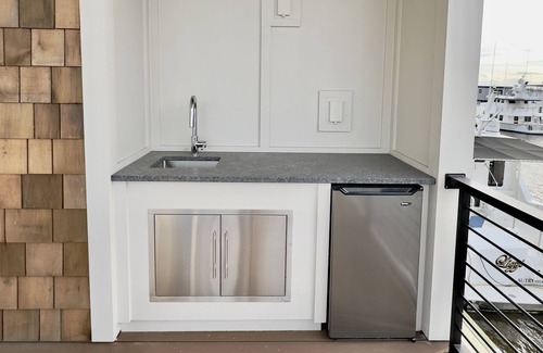 Just outside those doors, you'll find yourself on a large patio featuring an outdoor bar (sink & mini fridge), and a variety of comfortable furniture options. This patio is a fan favorite for everything from morning coffee, afternoon reading, evening spirits, or enjoying a meal. In the Summer months, you'll often hear live music coming from Marina Grill, our delicious on-site restaurant, or Live Oak Bank Pavilion Amphitheater, which is only a block away.