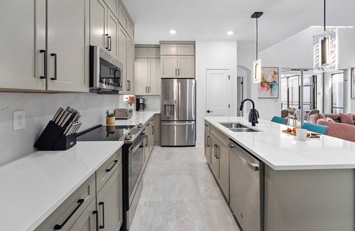 “Florida chic” are the words that come to mind as you enter the beautifully designed open-plan living/dining area. Marbleized white floors, sleek modern furnishings, and elegant artwork set the scene for a fabulous retreat. Relax in the cozy lounge area, where oversized mauve sofas and a wall-mounted flat-screen TV provide plenty of room for your entire crew to gather. Sit down to a feast at the extra-large, dark-wood dining table, featuring comfy seating for 10.