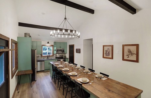 The oversized kitchen with a 15' custom dining table island, invites groups of guests to spend time together delicious meals or entertainment. The huge stone fireplace and living room create a warm and cozy lodge setting with modern conveniences like the wall-mounted smart TV and central air and heat, guests can truly relax and unwind in style.