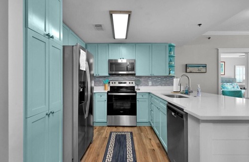 2 KING SUITES! Beautiful new floors! Painted cabinets! NEW TV's! New Kitchen! What's better than a great day at the beach? A GREAT nights sleep at the beach! We have ALL NEW mattress and box springs throughout the unit. Of course new mattress and box springs deserve new pillows so we've updated those too. Also we've just installed a new 48" television in the den along with a brand new Refrigerator!! It's been appliance updating this season for us. We've also added some new bed and bath linens for your comfort. This unit is the perfect spot for a relaxing vacation with the feel of home!