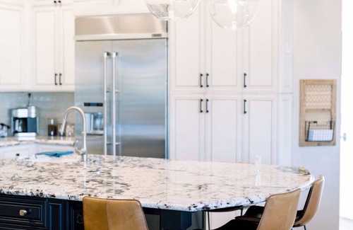 In the heart of the home, you will find an open concept floor plan in kitchen, living, and dining space with ample room for cooking, seating, and entertaining guests. The gourmet kitchen was designed with the home chef in mind featuring high-end stainless steel Jenn-Air appliances, basic cookware, an oversized refrigerator, a massive island, and plenty of counter and cabinet space. There is also a wet bar in this area with a separate sink and counter space. The laundry room is just off the kitchen and has a large front-loading Whirlpool washer and dryer available for guest use.