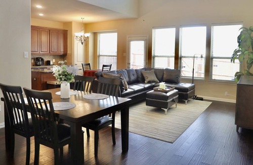 This is a beautiful 2-story Townhome with a large fully stocked kitchen and dining area plus lots of amenities including a 70in smart TV in the living room, electric fireplace, Smart TVs in all bedrooms, air hockey table and board games in the 2nd floor lounge. Located on a quite neighborhood; perfect for short term and long term stays for family and business.