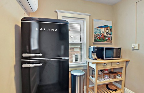 Welcome to the Flats of Lake Geneva! Located on a quieter side street on the northern end of Lake Geneva's downtown district, this renovated pair of suites will put you in a perfect location to enjoy all that our resort town has to offer without needing the car. Face-lifted and thoughtfully appointed throughout, Suite 1 features 1 bedroom (king), a full bathroom, and a common area cozy extra sofa, perfect for lounging or accommodating an extra guest. It's large enough for a smaller adult or child (under5'6) to sleep, offering a relaxed space for a good night's rest—without being a full-size bed. The Flats offer a quieter, spacious alternative to staying at one of Lake Geneva's busy downtown hotels. Suite 1 is equipped with a "kitchenette" set up, including a sink, refrigerator, microwave, coffee maker, and toaster (no stove/oven). We encourage you take advantage of all the great dining options around town! Step through the kitchen and onto the back-facing balcony to enjoy a morning cup of coffee or glass of wine before heading to dinner. Book today and make the Flats your home base for a convenient, unforgettable trip to Lake Geneva.