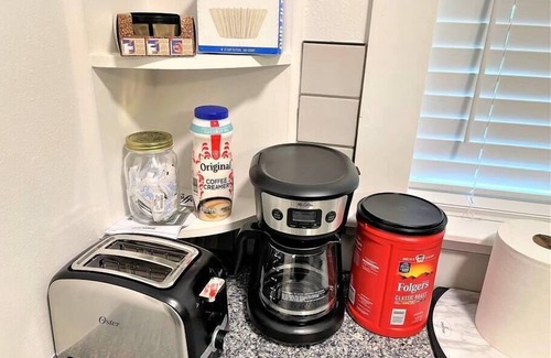 Fully equipped kitchen with cookware, dishes, coffee maker, toaster & more