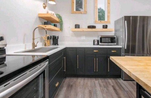 The open design lets you watch deer from bed, the sofa, dining or kitchen. Large windows overlook the 5 acre property abundant with trees. Two beds, one queen size and full on the platform above. There is a large island with plenty of pots, pans and cooking utensils. Fridge, oven, microwave and Keurig are all new and ready for your stay. One bathroom with a standup shower, vanity and plenty of towels. Out back is a large patio overlooking the wooded area with table and chairs for a quiet meal.