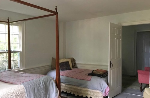 This is a rustic old Colonial house- full of history and character. In the back yard there is an outdoor dining table and chairs for your use alone. The guest space is entered through a private door from the back yard, into a private entryway with space for shoes, coats, sports gear, etc. and a sitting area. There are guide books and books of local interest, puzzles, and toys. The first bedroom has one queen and one twin bed, closet and drawer space to store your clothes and belongings, and a coffee and tea service. The one bathroom is off of this bedroom. The second bedroom has a beautiful queen sized canopy bed and a twin bed, with an antique settee and slipper chair for lounging. Both bedrooms have block out curtains. There are plenty of extra blankets and quilts for chilly nights. The basic bathroom which is accessed through the first bedroom has a high-pressure shower, toilet, sink and cupboard for storage. Our bed and bath linens are of high quality natural materials. The entire space is furnished with authentic period antique furniture, antique hand made and oriental rugs, and decorated with plenty of original New England artwork.