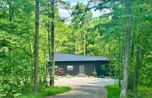 The Hollow House is a modern retreat tucked into the woods of Hocking Hills, thoughtfully designed for anyone seeking an escape to nature. This architecturally striking cabin features a grand open living space anchored by a wall of windows, drawing the forest indoors and creating a seamless connection to the woods. The open-concept layout includes a full kitchen with a large island, a dining area, and a cozy living space—ideal for gathering, sharing meals, and reconnecting, whether you're here with family, friends, or simply looking to unwind in solitude.