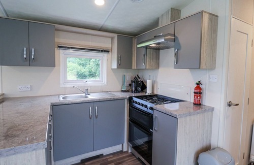 The Hoot, a single-storey caravan, consists of an open-plan living space including a kitchen with gas oven and hob, microwave, fridge/freezer, and washing machine, a dining area, and a sitting area with Smart TV and electric fire. The bedroom is a double with en-suite basin and WC. There is a shower room with walk-in shower, basin, and WC. Outside, there is an enclosed wraparound garden with lawn, patio, furniture, fire pit, and off-road parking for two cars. Two well-behaved pets welcome. Sorry, no smoking. Shop 2.8 miles, pub 1.3 miles. WiFi, fuel, power, bed linen and towels are all included in the price. Bring your special someone to The Hoot for a private retreat. Note: Check-in from 4 pm, check-out by 10 am. Note: This property has a Good Housekeeping Bond of 150 GBP. Note: Steps up to the property, please take care.