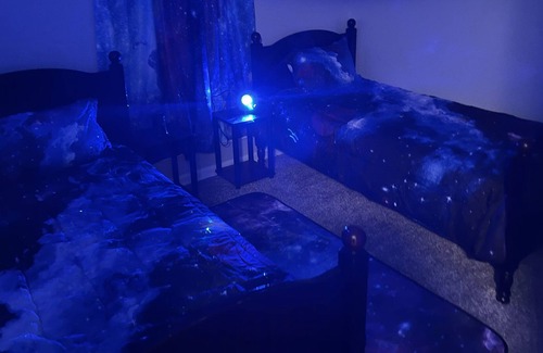 Make some memories at this unique and family-friendly Galaxy House. This place is is deck out with cool colors and design for a fun intimate night with friends or family. It has 5 spacious themed bedrooms and 3 full bathrooms. The amenities include a mini exercise room, hot tub, and a built in theater room. The theater room comes with complimentary snacks and luxury massage chairs. Each room offers a different aura and will give you a 5 star experience.