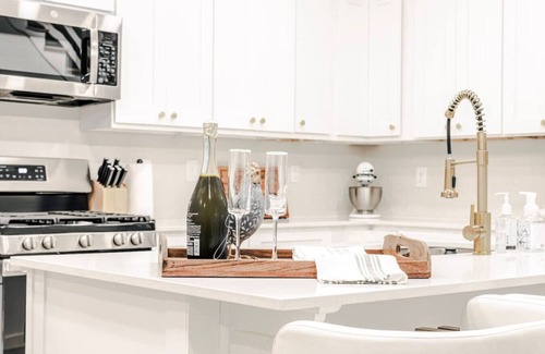 - Fully equipped kitchen with modern appliances, drip coffee maker, and bar stool seating for three