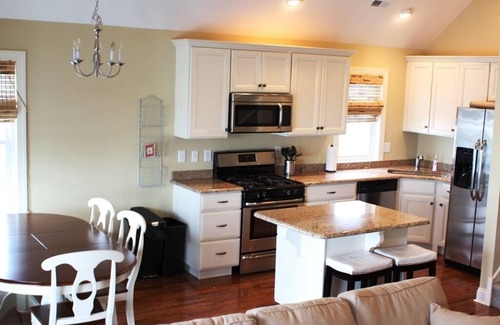 Our home offers an open floor plan with sleeping accommodations for 7. The great room boasts a beautiful vaulted ceiling offering plenty of natural light. The kitchen features granite counter tops and a center island with seating for two. The dining area has a custom banquette which provides additional seating. The beautiful kitchen is fully equipped with a microwave, oven range, side by side fridge (with ice maker and purified water dispenser), dishwasher, toaster, coffee maker, slow cooker, electric skillet, blender, hand mixer, immersion blender, all necessary service ware, cookware and cooking utensils.