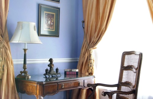 This elegant private room on the 2nd floor of the inn's main house features tone of regal lilac and Napoleonic influence. It features a queen size sleigh bed with canopy accent, lounging couch, writing desk, wireless internet and TV. The full bath offers views of the side garden and standup shower cabinet. (Individual air conditioning and heating).