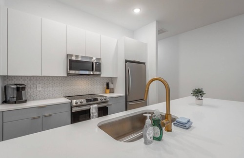 Spacious Living: An open-concept design features a sleek, fully equipped kitchen, a cozy living area with a fireplace, and ample natural light.