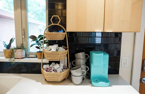 The Knox is our home away from home that comes with 5 memory foam beds located in a quiet neighborhood. The living room, kitchen and dining areas are an open concept for an inclusive vibe. From the moment you pull up, you'll be greeted by the pops of bright turquoise throughout. As you enter the house you'll see through the big windows with tons of natural light calling out to the large backyard. Then you'll notice the double width chaise lounge sofa and fully equipped kitchen, perfect for making meals for a group. Enjoy coffee in the mornings on the private back patio dining area or sunset conversations around the cozy fire pit. The large backyard is landscaped beautifully with huge trees and tall grasses. You're in the middle of the city but once you step into the backyard oasis you'll be surrounded by lots of natural elements of inviting nature.