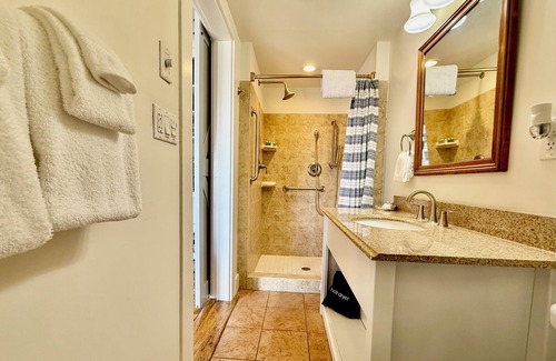 The suite includes a spacious bathroom with a large tiled walk-in shower and a granite vanity.