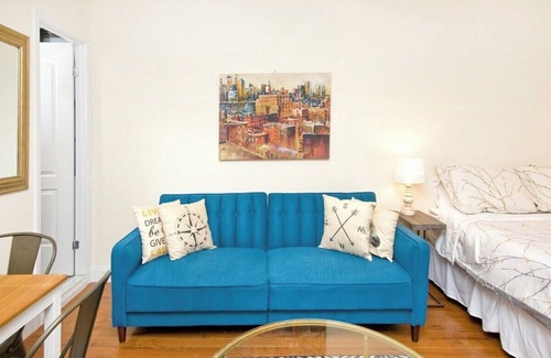 Experience The Lexy III, a modern studio on the second floor in Midtown East, New York. This elevator-accessible unit is ideal for two guests. The kitchen features a stove, oven, and dishwasher. Wi-Fi, air conditioning, and a TV make it perfect for work or relaxation, while family-friendly touches ensure comfort for all.