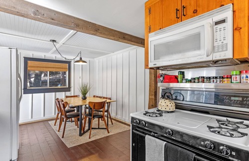 Prepare delicious meals in this fully equipped, rustic kitchen featuring charming wood cabinetry and modern conveniences. With all the essentials provided, cooking your favorite dishes will be a breeze.