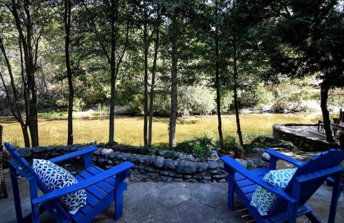 Perfect for a getaway from your busy schedule~The Lodge harkens back to time when life was less hectic. The Lodge has a kayak and water tubes to go down the river for your use and out the back door or just enjoy a cup of coffee or a glass of wine on the deck percheded above the river.