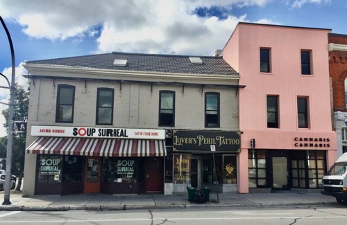 The space is in the funky old Baker Building. It is located right across from the liquor store .The street level tenants are Soup Surreal - do take out for easy meals 'at home', Diamond Dog Vinyl and Knit Stitch. Friendly vibe. 3 minute walk to the Avon Theatre, 20 minute walk to Tom Patterson Theatre and 30 minute walk to Festival Theatre.