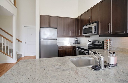This stylish loft in Alexandria, VA offers modern design with personality and a prime location just steps from everything. Perfect for those seeking a unique stay, with amenities like indoor cycling, a seasonal pool, and a dedicated office area.