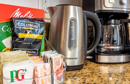 The open kitchen is separated from the dining and living areas with a bar height countertop with stools. The kitchen has granite countertops and a large pantry. The kitchen is fully equipped with a dishwasher, microwave, coffee maker and fridge with filtered water and an ice maker. All the cookware, dishes and utensils you need are included. The dining area seats six and there is seating for another three at the counter.