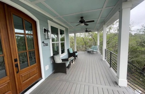 Walking up the stairs from underneath the house you walk into the kitchen/living room. There is a very large granite countertop with seating for 3. Also in kitchen is a built in convection oven, dishwasher, side by side fridge and a gorgeous farmhouse sink. Toward front of the house is a dining table that will seat 8. Across the room is a couch and loveseat with antique lobster trap for a coffee table. Walking toward the back of house passing a half-bath is a butler’s pantry with a smaller fridge for extra space. Then walking into the first of 2 master suites, there is a king bed. There is a seperate french door entrance to the porch along with tv with dish network. Into the first master Bath there is a shower, tub and double vanity with toilet room. Walking up stairs you will find a multi Cade Video game across from a small futon on loft leading to the outside upper porch. Also on second floor there are 3 bedrooms. One bedroom has bunk beds that will sleep 4 kids if you use the pull out trundle. There is also a toddler bed in this room to use as needed. Additionally, There is a mattress in master closet upstairs that you can put on the floor if you have someone that may fall off or if you need an additional bed. Another bedroom has two twin beds and the last one is the second master that has two full beds and tv. A bathroom with shower and double vanity is connected. Another full bath with tub is upstairs for use by other 2 bedroom occupants. There is also a futon mattress in the upstairs master closet that can be put in the loft as needed extra sleeping space.