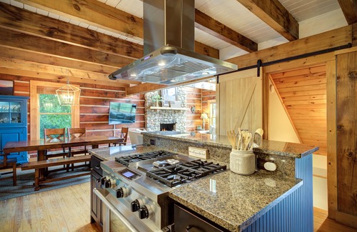 On the main level, the beautiful stone fireplace anchors the 2 story great room which overlooks the gorgeous views and opens to the main deck. The large guest room on this floor offers beautiful mountain views with deck access. There is a full bathroom on this floor, which also houses the washer and dryer, available for guest use and an initial supply of laundry detergent.