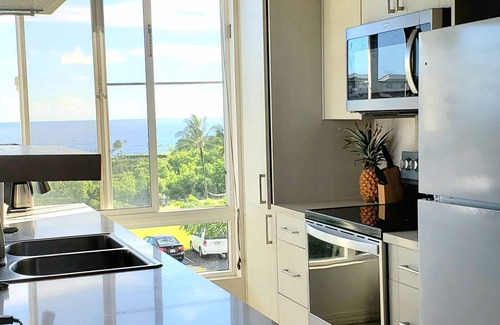 Spacious, top-floor, two-level, end unit with all the essentials and amenities you want on your restful, fun, and memorable vacation. Beautiful hardwood floors in main living areas, new tile flooring in all bedrooms, and clean and spacious tiled bathrooms. Tropical style interior furnishings and decor with clean and super comfortable furniture and beds. Cable TVs, DVD's, stereo, CD, and radio. Full kitchen with all amenities, including a fabulous ocean view and 3 sides of floor-to-ceiling windows to let in the ocean breezes. Large lanais off the living room and master bedroom where you can watch whales and waterfalls during the seasons. Farily new kitchen appliances and tile counter top. There's plenty of seating and dining options either inside the condo, or on the front or back lanai.