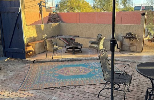 The interior highlights hand-carved Mexican wood furniture and striking desert-inspired art throughout. Multiple patios invite you to soak in the Tucson climate, while the backyard presents unique amenities, including a basketball court, a private yoga studio (fully equipped with mats and props) for moments of tranquility, and a meditative rock labyrinth for spiritual reflection. For those seeking deeper wellness experiences, optional yoga classes, tea ceremonies, and reiki healing sessions are available through our local host.