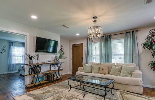 The "Music Note" is Murfreesboro Tennessee 's best kept secret. Located only two minutes from MTSU campus yet surrounded by quiet country serenity. The "Music Note" Boasts three bedrooms with two full bath's and open air living room area and newly remodeled state of the art Chic Kitchen. The home is also fully equipped with a laundry room area, new State of the art washer and Dryer.Huge covered porch and a large fenced in private back yard with plenty of shade! The Music note also has a newly built deck and all of the luxury amenities one would expect for a one of a kind five star experience. Inspired by the culture of the "Music City" from the entry way and all throughout the "Note" you will be inspired by various genres of music creating a vibe like no other. We look forward to having our guestsexperience all of it's best kept secrets making way for an unforgettable stay!