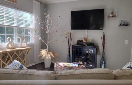 Our living area contains a coastal sofa with a Roku for your viewing pleasure. Grab the labeled remotes, log into your account, relax, and watch your favorite shows.