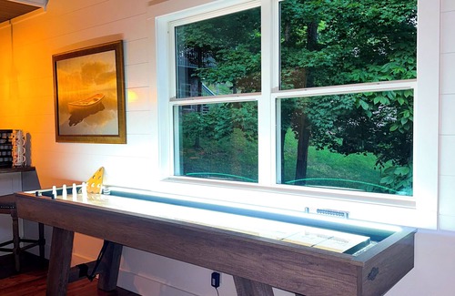 **Outdoor Fun:** A flat area by the water has been designed for recreational activities, such as cornhole. We also offer a water slide and kayaks for your enjoyment.