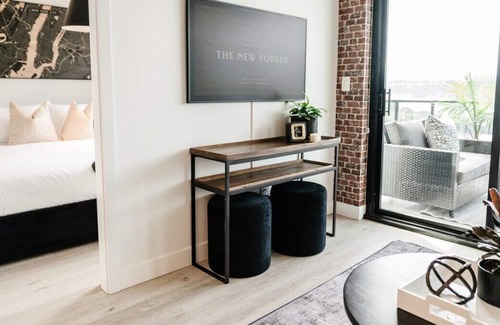 The New Yorker boasts a a fun and themed design featuring 1 bedroom 1 den and 1 bathroom in a condo that sleeps six. The master bedroom boasts a king sized bed and double bunk beds located in the den. Unwind and enjoy your morning Nespresso coffee or evening beverages on your lake view patio, immersed in the stunning beauty of Kelowna. A modern and well-stocked kitchen with stainless steel appliances will have everyone gathering around. The bedrooms are upgraded with cozy Haven mattresses to ensure the most perfect sleeping environment on your vacation.