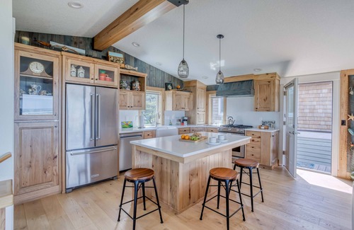 Be among the first to stay at the Nickels Quarters- a luxurious ocean view, beachfront custom home recently built in the Nedonna Beach neighborhood of Rockaway Beach. This 2-bedroom 2.5-bathroom residence is one-of-a-kind, combining contemporary amenities with hand-crafted woodwork, refurbished nautical décor, and original art throughout the home.