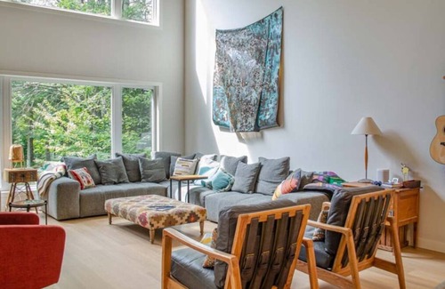 Nestled along the peaceful banks of the Burnt River, The Nottage welcomes you into a world where eco-friendly luxury meets the soothing embrace of nature. This newly constructed Kawartha Lakes cottage rental boasts four bedrooms, two of which are primary suites with private balconies, making it the perfect retreat for families and friends seeking both seclusion and comfort.