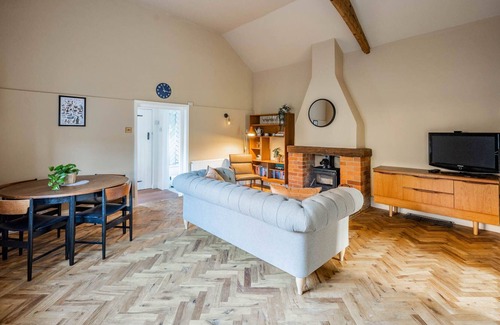 The main living space has a large sofa facing a wood burner, great for keeping warm throughout the colder seasons, and a smart television for relaxing with your favourite shows. This room also includes a dining table with seating for up to five guests.