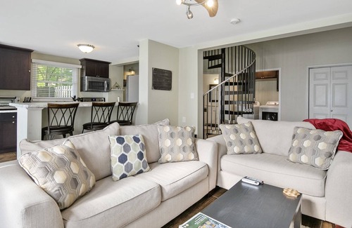 On the main floor, the light and bright living room features a comfortable couch and loveseat and a 55” Smart TV. Whether you have dinner delivered or decide to put the updated appliances to work, the modern kitchen has all the essentials, plus a breakfast bar for casual dining. The breakfast station is equipped with a Keurig coffee maker and complimentary breakfast items. The Hideaway’s beautifully renovated bathroom has a full-size vanity and a walk-in shower. A spiral staircase leads to the large sleeping loft and its luxurious queen bed. The loft also has a cozy papasan chair for curling up with a book or indulging in an afternoon nap. Please be aware, the spiral stairs require some dexterity to navigate and the bedroom has a low ceiling.