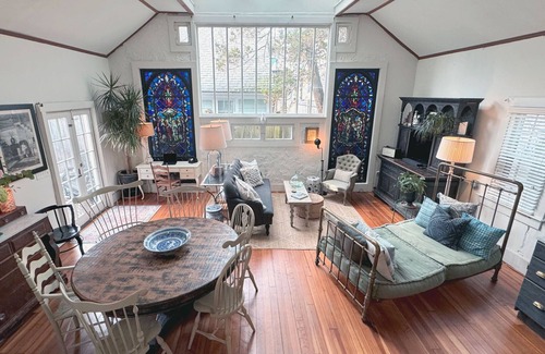 Once Pauline Palmer’s art studio, this charming hideaway features two king suites with en-suite baths, a soaring great room with an open cottage kitchen, and a cozy loft—perfect for lounging or hosting an additional guest. Outside, a private terrace invites alfresco dining and relaxed evenings.