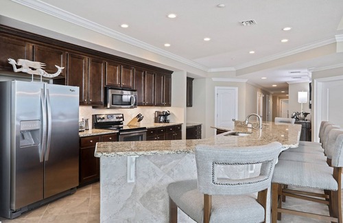 The condo's master bedroom has a king bed, as does the 2nd bedroom and the 3rd bedrooms, the 4th bedroom has two full sized beds and we have a sleeper sofa king in the living room. We have installed custom cabinetry and granite countertops throughout the condo.