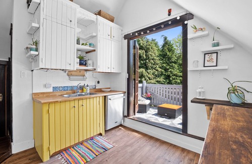 Cozy bedrooms, a clawfoot tub, & a private treetop patio. Charm, comfort, & a serene oasis. Perfect for couples, remote workers, nature lovers, or solo adventurers.